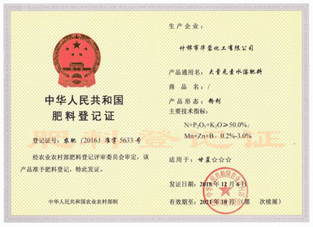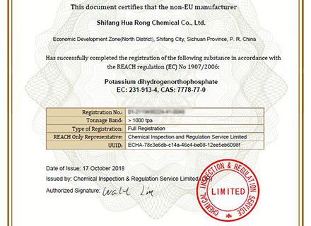 什邡市華蓉化工有限公司原名什邡華蓉科技有限責任公司,位于磷礦資源豐富的四川省什邡市,距成都60公里,交通運輸便利,是一家專業生產、研發精細磷化工系列產品的大型生產企業。生產設備先進,技術研發團隊強大,現公司占地面積約30000平方米,擁有5條生產線,主要生產大量元素水溶肥、磷酸二氫鉀、磷酸二氫銨、磷酸氫二銨、硝酸鉀、磷酸脲以及磷酸,年總產量為100000噸以上。公司資質齊全,管理規范,已取得安全生產許可證、ISO9001:2015質量管理體系認證、食品生產許可證、工業產品生產許可證、自營進出口經營權進出口證書以及出口歐盟國家部分產品的REACH證書。